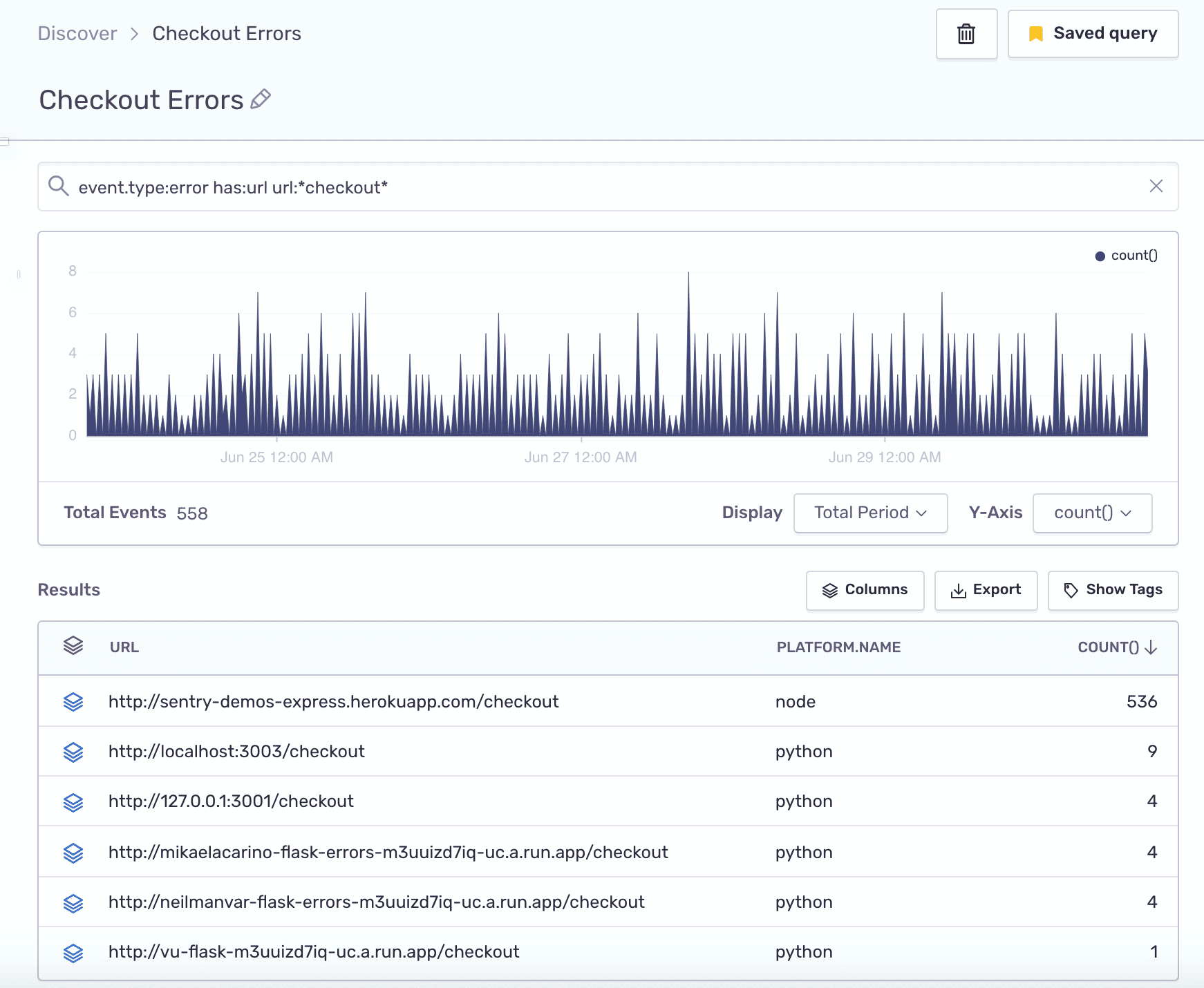 Sentry notifies you in real-time when your application breaks, and then provides the information and tools to triage and resolve the error. With Discover, you can take a more proactive approach to find the major issues that break your apps. Building that query might look like this: